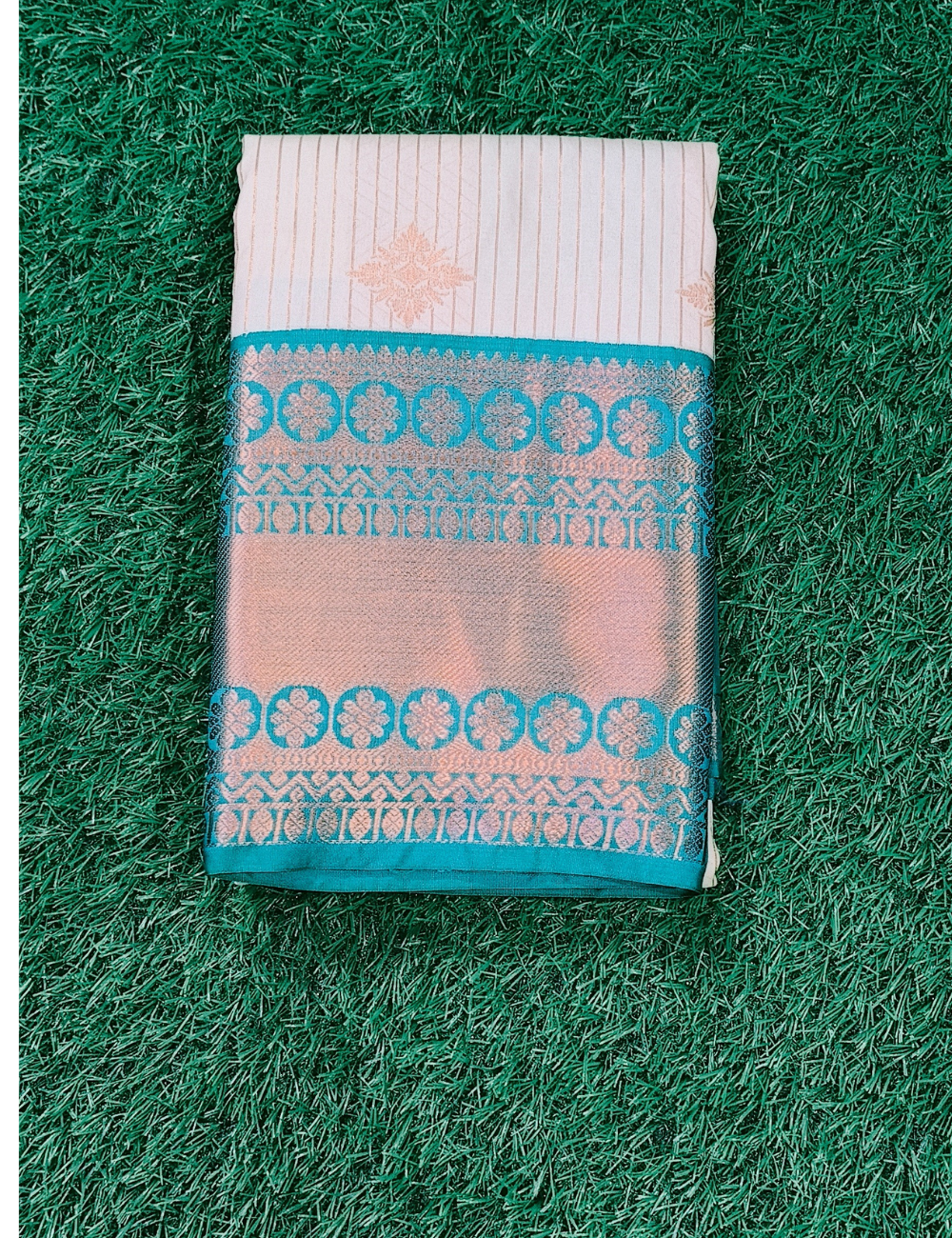 Elevate your ethnic wardrobe with this exquisite beige and peacock blue silk saree, a perfect blend of tradition and modern elegance. The subtle beige body exudes timeless grace, beautifully contrasted by a rich peacock blue pallu and border that adds a vibrant pop of colour.