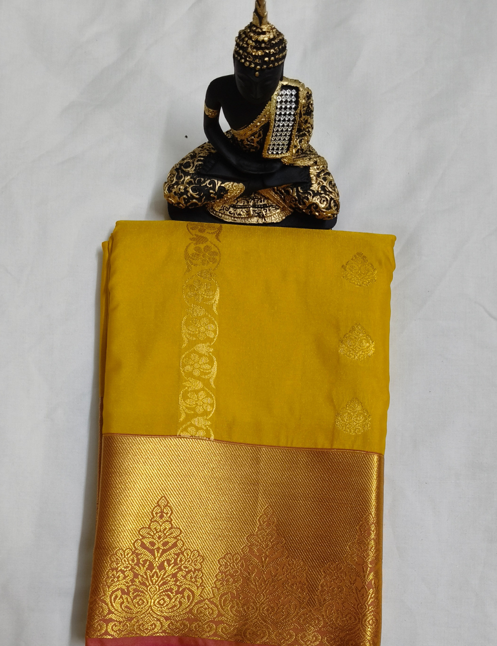 Elevate your traditional wardrobe with this stunning mustard yellow with purple korvai silk saree — a timeless blend of heritage and elegance. Crafted from rich silk, this saree features a vibrant mustard yellow body adorned with subtle zari motifs, beautifully contrasted by a deep purple korvai border and pallu. The intricate weaving and the bold colour contrast make it perfect for festive occasions, weddings, and grand celebrations.