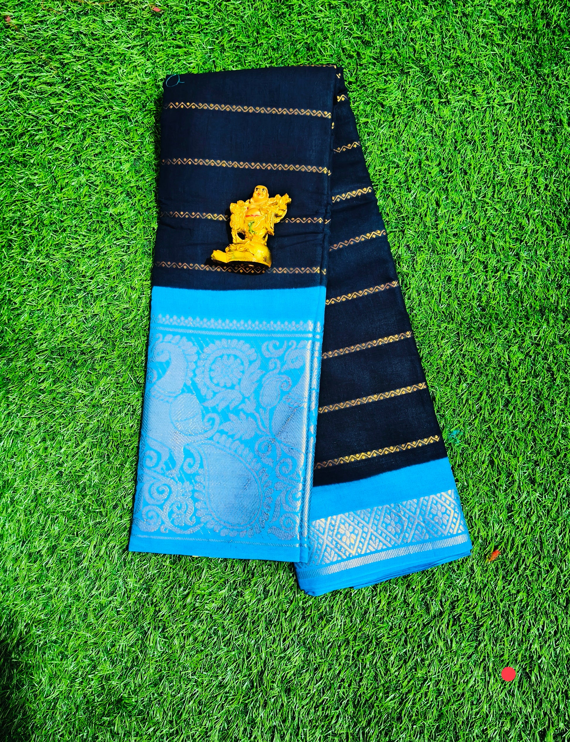 Base Color: Deep navy blue body contrasted by a refreshing sky blue pallu and border.